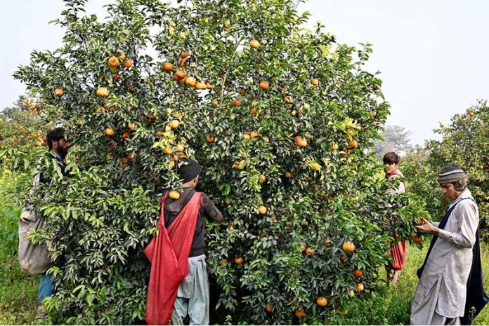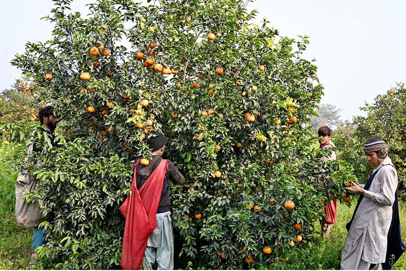 Labourers are busy plucking oranges from an orange garden at 75-Chak to deliver in fruit markets.