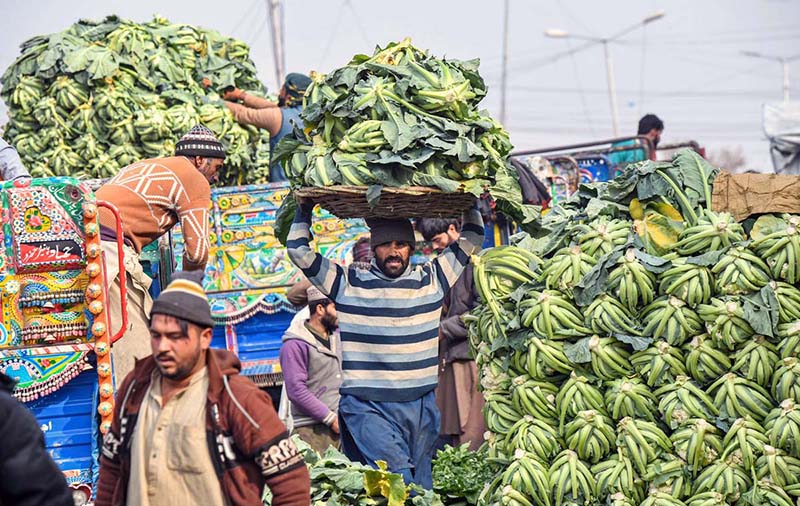 Labourers are busy unloading cauliflower from delivery truck at Pirwadhi Fruit and Vegetable Mark in Federal Capital