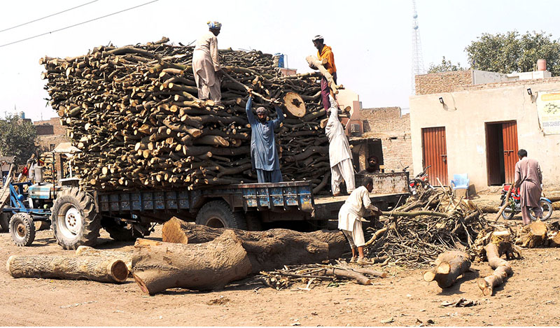 Labourers are loading wood on the tractor trolly at the timber market