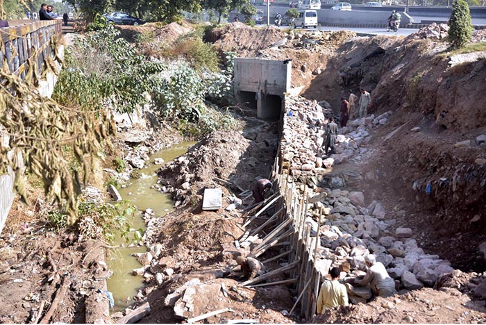 ISLAMABAD: November 18 – Labourers busy in construction work of Karnal Sher Khan Shaheed Road with the help of Heavy machinery during development work in the city.