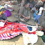 Labourers busy in construction work of bridge at service road along Karnal Sher Khan Shaheed Road during development work in the city.