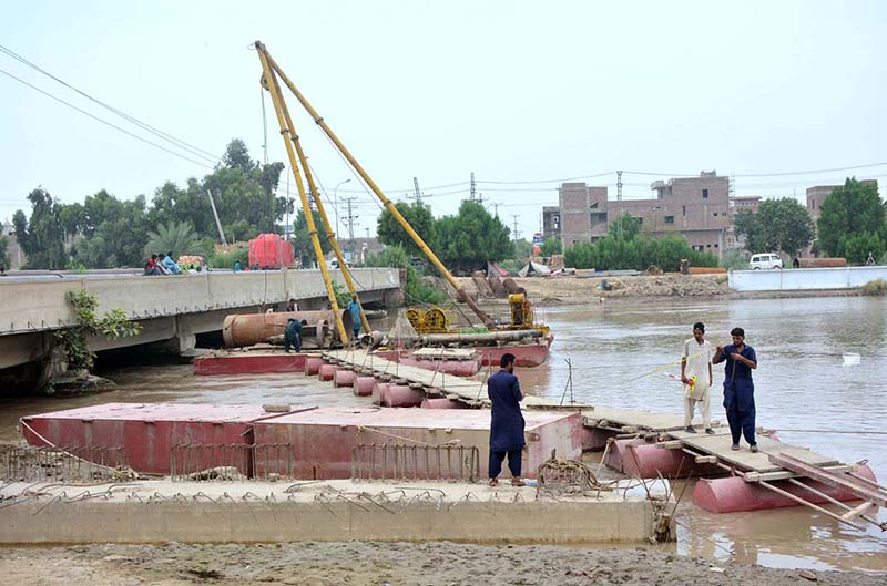 Labourers busy in construction work of bridge on the Pinyari Canal.