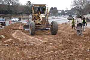 Labourers busy in construction work of Serena Chowk Interchange Project during development work in the Federal Capital