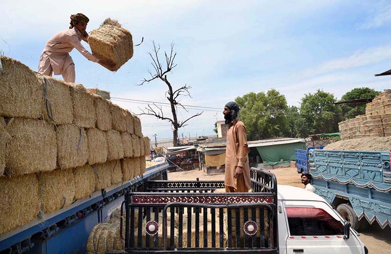 PESHAWAR: June 07 – Labourers busy in loading dry fodder in a delivery van at Chamkani area to deliver in different areas.