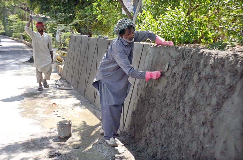 LAHORE: May 01 - Labourers busy in plaster roadside protective wall as the world celebrates International Labour Day. May 1st, International Workers’ Day, commemorates the historic struggle of working people throughout the world. In 1884, the Federation of Organized Trades and Labour Unions passed a resolution stating that eight hours would constitute a legal day’s work from and after May 1, 1886.