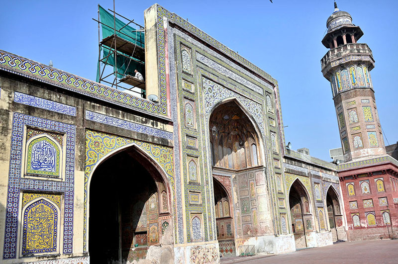 LAHORE: October 30 - Labourers busy in renovation work to the historical Mosque Masjid Wazir Khan at Walled city. The Wazir Khan Mosque is 17th century. The mosque was commissioned during the reign of the Mughal Emperor Shah Jahan as part of an ensemble of buildings that also included the nearby Shahi Hammam baths. Construction of Wazir Khan Mosque began in 1634 C.E. and completed in 1641. APP/MTF/MAF/TZD/ABB