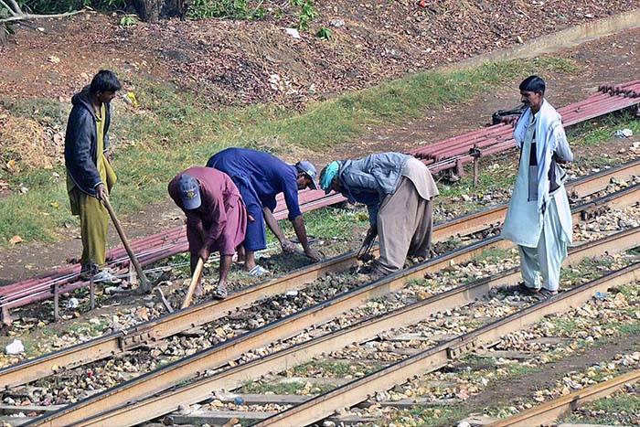 Labourers busy in repairing the rail track near railway station.