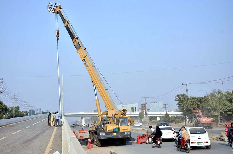 Labourers busy in work of flyover placing street light poles with the help of heavy machinery at Walton Road.