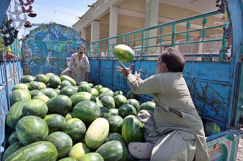 Labourers busy unloading watermelon on the loading truck at fruit Market.