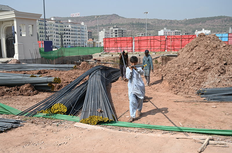 ISLAMABAD: February 28 – Labourers work on the construction of a building at Park View City in the Federal Capital. APP/RNK/FHA