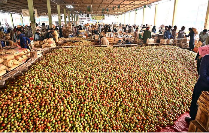 HYDERABAD: November 25 – Women labourers pack freshly harvested tomatoes into wooden boxes at the vegetable market. APP/FHN/MAF/TZD/FHA