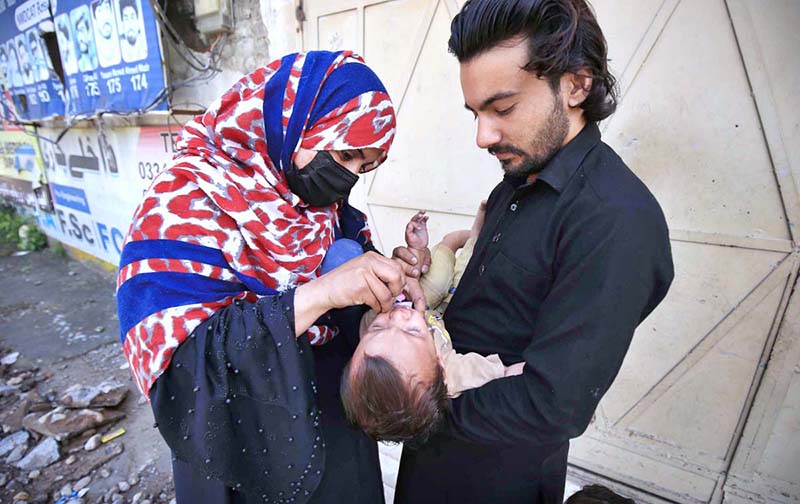 Lady Health Worker administering polio drops to a child during anti polio campaign in t Provincial Capital.