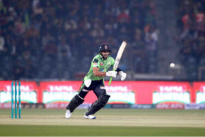 Lahore Qalanders batter Sahibzada Farhan playing shot during the Pakistan Super League (PSL) Twenty20 cricket match between Lahore Qalanders and Islamabad United at the Gaddafi Cricket Stadium