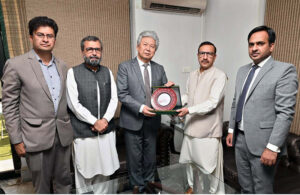 Managing Director Associated Press of Pakistan, Muhammad Asim Khichi presents souvenir to Ambassador of Kyrgyz Republic, Avazbek Atakhanov during his visit to APP Headquarters