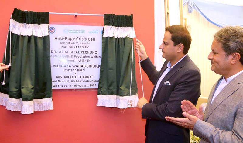 KARACHI: August 04 - Mayor Karachi Barrister Murtaza Wahab is unveiling the strength of Sindh's first Anti-Rape Crisis Cell in collaboration with Sindh Health Department and United Nations Program for Women at Police Surgeon Office Civil Hospital Karachi. APP/ABB/ZID