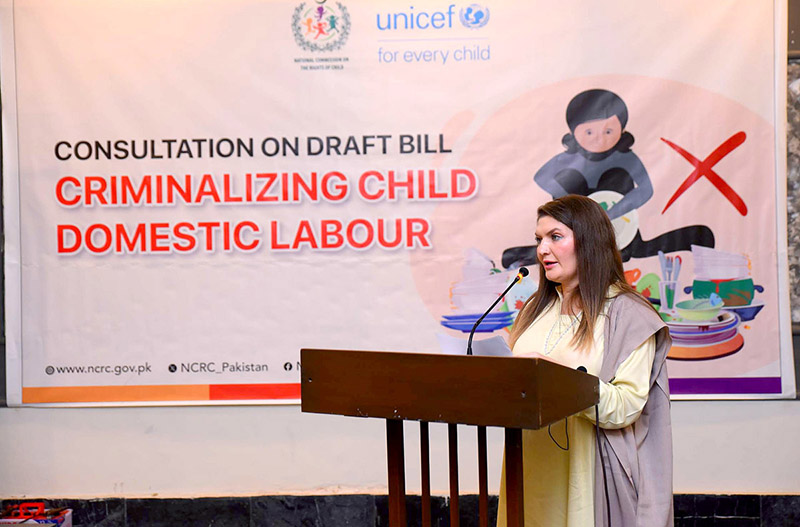 Member Khyber Pakhtunkhwa, National Commission on the Rights of Child Nadia Bibi addressing during Consultation on draft bill criminalizing child domestic labour.