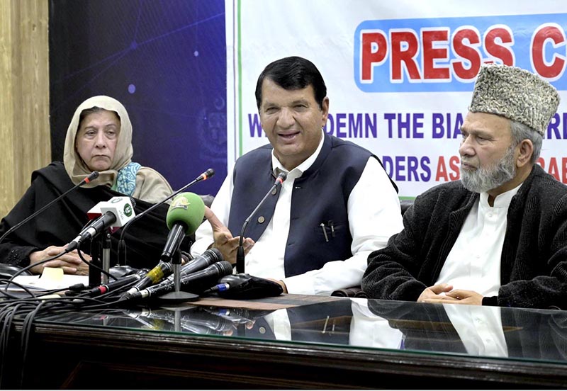 Minister for Kashmir Affairs and Gilgit-Baltistan, Engr. Amir Muqam addresses a press conference alongside All Parties Hurriyat Conference Azad Jammu and Kashmir convener Ghulam Muhammad Safi and Hurriyat leader Shamim Shawl at PID.