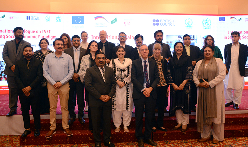 Minister of State for Education and Professional Training Ms. Wajiha Qammar and German Ambassador to Pakistan Ms. Ina Lepel, in a group photograph during the two-day International Dialogue on “TVET in the Shifting Socio-Economic Paradigm” at a local hotel