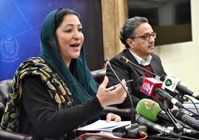 Minister of State for Federal Education and Professional Training, Ms. Wajiha Qamar addressing a press conference at PID Media Center.
