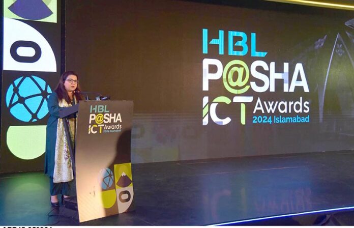 Minister of State for IT and Telecommunication Ms. Shaza Fatima Khawaja addressing HBL-P@SHA ICT Awards 2024 ceremony.