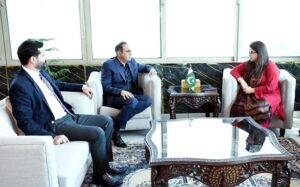 Minister of State for IT and Telecommunication Ms. Shaza Fatima Khawaja in a meeting with CEO Taavun (Pvt) Limited Muhammad Shahbaz Khan and CEO Wateen Adil Rashid.