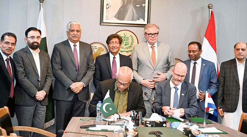 ISLAMABAD: February 16 - Ministry of Water Resources and IHE Delft delegation sign MoU to strengthen Pakistan-Netherlands water cooperation, witnessed by Federal Minister for Water Resources Mian Muhammad Mueen Wattoo and Ambassador H.E. Mr. Robert-Jan Siegert. APP/TZD/FHA
