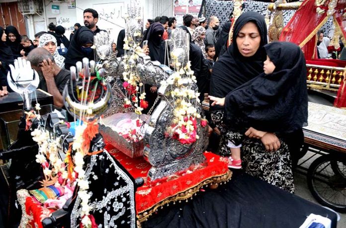 KARACHI: July 28 – Mourners touch Zuljinah during the main procession of 9th Muharram-ul-Haram observing Youm-e-Ashur at M.A Jinnah Road. Muharram ul Harram, the first month of the Islamic calendar is known as the mourning month to pay homage in remembrance of the martyrdom (Shahadat) of Hazrat Imam Hussain (AS), the grandson of the Holy Prophet Mohammad (SAWW), along with his family members and companions at the battle of Karbala. APP/AMH/ABBAPP21-280723