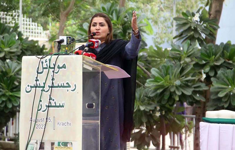 KARACHI: August 05 – Federal Minister for Poverty Alleviation and Social Safety and Benazir Income Support Programme (BISP) Chairperson Shazia Marri (BISP) addressing to the audience at inauguration ceremony of “Mobile Registration Vehicle Centers”. APP/SDQ /FHA/ZID