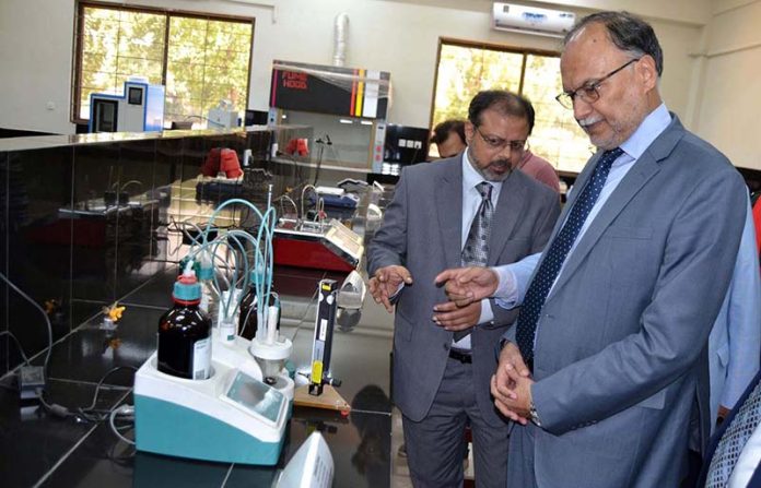 LAHORE: June 13 - Federal Minister for Planning Development and Special Initiatives Prof. Ahsan Iqbal visiting lab of the institute after the inauguration of the new building of Energy and Environment Engineering at University of Punjab. APP/MHA/MAF/FHA