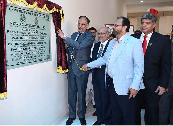 LAHORE: June 13 - Federal Minister for Planning Development and Special Initiatives Prof. Dr. Ahsan Iqbal unveiling the plaque to inaugurates ceremony of the new building of Institute for Energy and Environment Engineering at Punjab University. APP/MHA/MAF/FHA