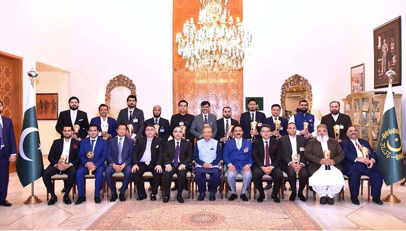President Dr. Arif Alvi in a group photo with the winners of the Lahore Chamber of Commerce and Industry (LCCI) IT Excellence shields at Aiwan-e-Sadr