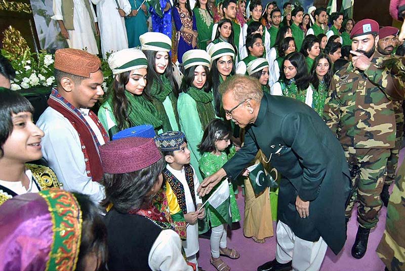 President Dr. Arif Alvi shaking hands and exchanging Independence Day greetings with children at the official flag hoisting ceremony on the 77th Independence Day of Pakistan