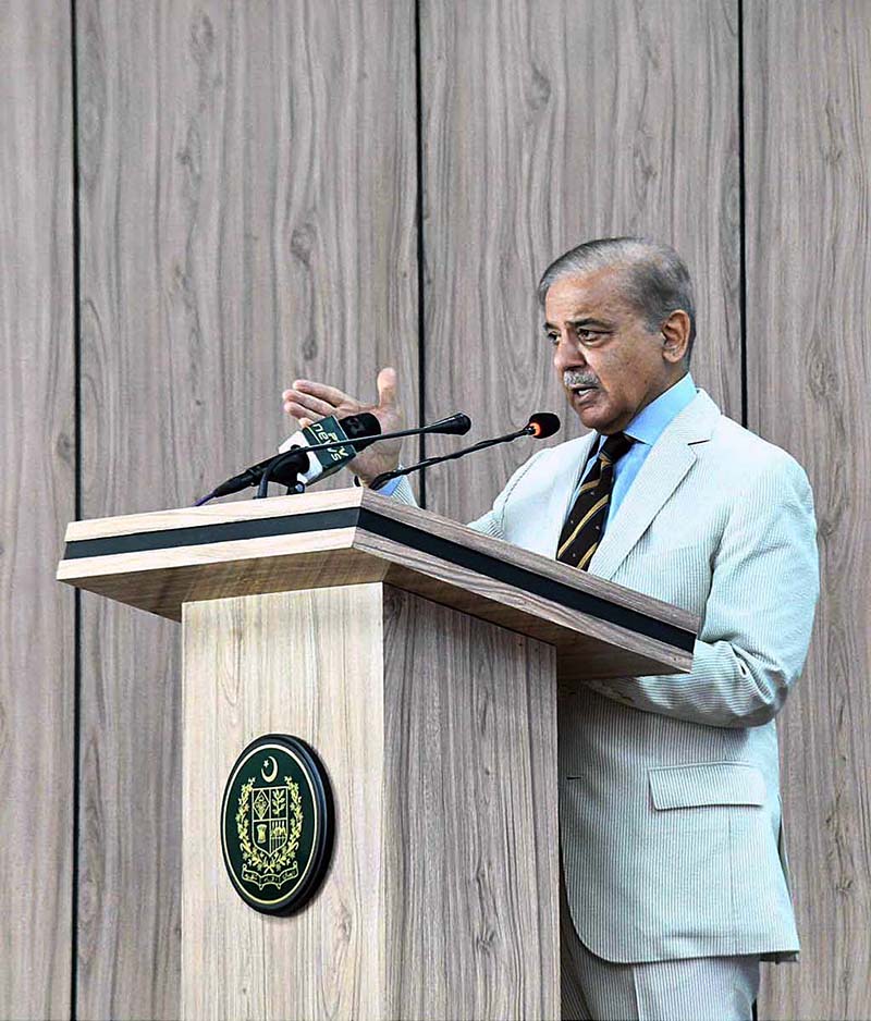 ISLAMABAD: August 08 – Prime Minister Muhammad Shehbaz Sharif addressing the launching ceremony of Prime Minister’s Health Program for journalists, media workers, artists and technical resource workers. APP/MAF/TZD
