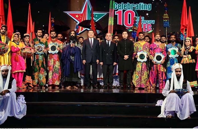 Prime Minister Muhammad Shehbaz Sharif and special representative of Chinese President Xi Jinping and Chinese Vice Premier He Lifeng in a group photo with Pakistani cultural performers and renowned Pakistani artists on a ceremony to commemorate the 10th anniversary of the commencement of China Pakistan Economic Corridor