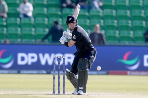 New Zealand batter Will Young playing shot during the ICC Champions Trophy one-day international (ODI) Semi-Final cricket match against South Africa at the Gaddafi Stadium