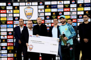 Pakistan batter Salman Ali Agha receives ‘Player of the Series award during award distribution ceremony of the Tri-Nation series at the National Stadium