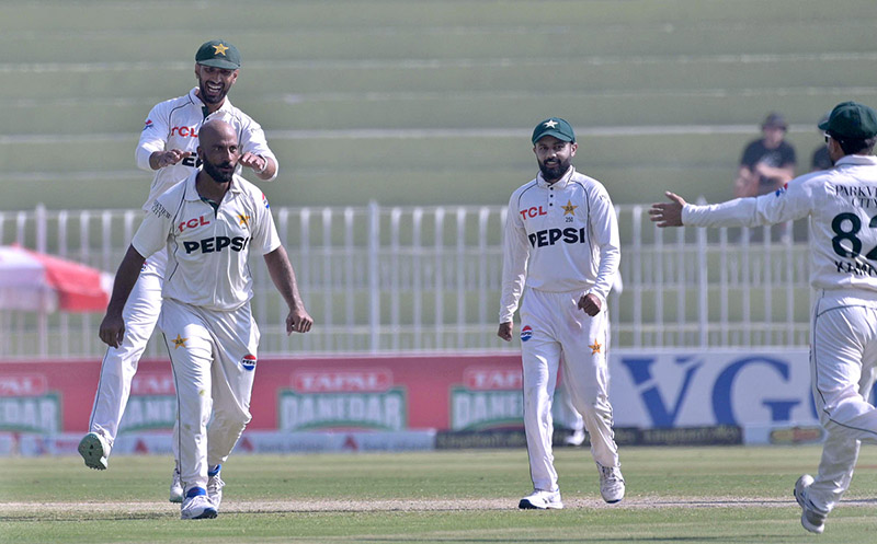 RAWALPINDI: October 26 – Pakistan players celebrating the wicket of England batter Jamie Smith during the 3rd day of the last cricket Test match between Pakistan and England Pindi Cricket Stadium. APP/ADZ/ABB