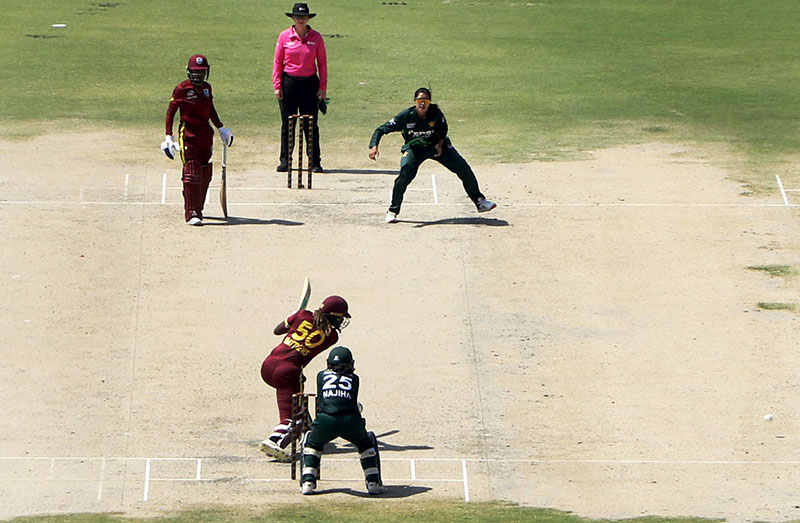 APP31-210424 KARACHI: April 21 – APP32-210424 KARACHI: April 21 – West Indies Women’s Cricket Team Captain Hayley Matthews play a shot during 2nd ODI cricket match played between Pakistan Women’s team vs West Indies Women’s cricket team at National Stadium. APP/AMH/FHAAPP33-210424 KARACHI: April 21 – Pakistan Women’s Cricket Team ODIs Captain, Nida Dar taking wicket of the West Indies batter Aaliyah Alleyne during 2nd ODI cricket match played between Pakistan Women’s team vs West Indies Women’s cricket team at National Stadium. APP/AMH/FHA