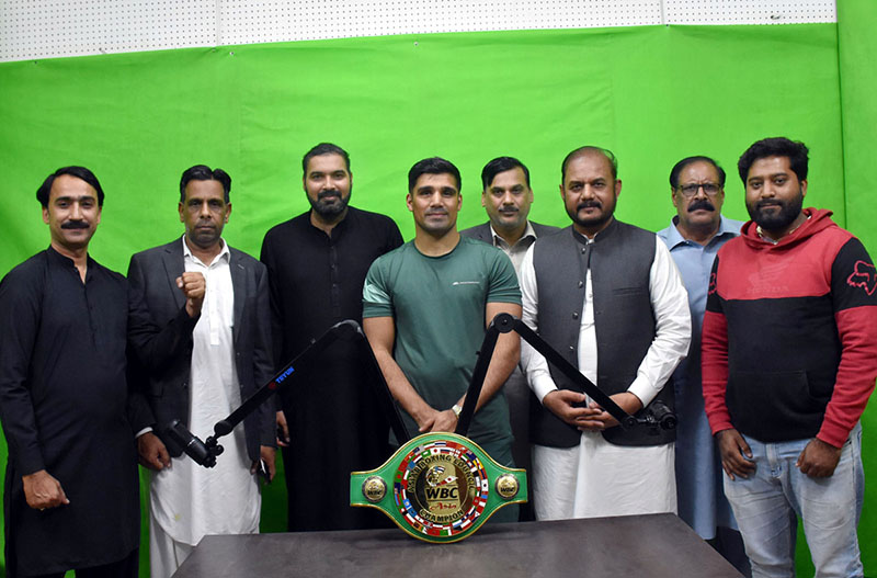 Pakistani boxer Muhammad Ali in a group photograph with the employees during his visit to the Associated Press of Pakistan’s (APP) bureau office in Lahore. Muhammad Ali recently won the WBC Asia Welterweight Championship by defeating an Indian boxer.