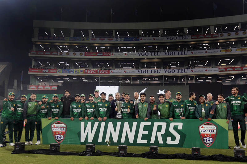 LAHORE: February 01 - Pakistani players and management pose for a group photograph with PCB Chairman Mohsin Naqvi after winning the series and the third Twenty20 international against Australia at Gaddafi Stadium. APP/MTF/FHA