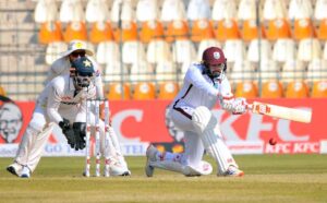 Pakistani wicketkeeper Mohammad Rizwan stumps out West Indies’ captain Kraigg Brathwaite during the 2nd day of the second Test cricket match between Pakistan and West Indies at the Multan Cricket Stadium