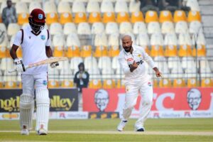 Pakistan’s Sajid Khan celebrates after taking the wicket of West Indies’ captain Kraigg Brathwaite during the third day of the first Test cricket match between Pakistan and West Indies at the Multan Cricket Stadium