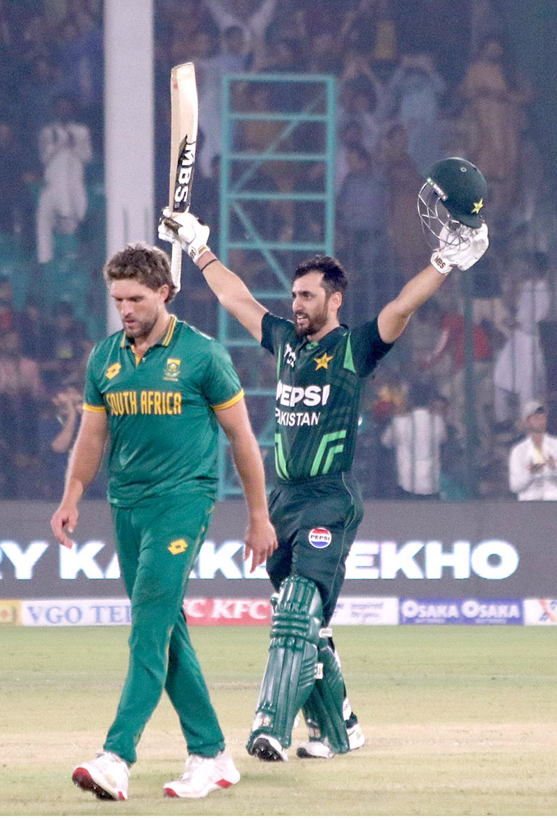 KARACHI: February 12 - Pakistan's Salman Agha celebrates after scoring a century (100 runs) during the ODI cricket match of Tri-Nation series between Pakistan and South Africa at the National Stadium. APP/AMH/IQJ/ABB