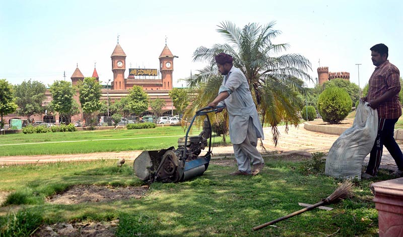 Parks and Horticulture Authority (PHA) gardeners mow the grass at Railway Station Park
