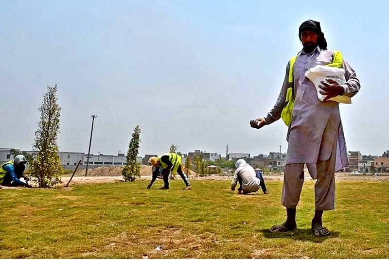 Parks & Horticulture Authority (PHA) gardeners plant grass seeds at a plot near Shahdara