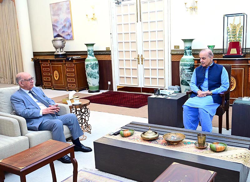 ISLAMABAD: July 13 - Parliamentary leader of Pakistan Muslim League (N) in Senate and Chairman Senate Standing Committee on Foreign Affairs Senator Irfan Siddiqui calls on Prime Minister Muhammad Shehbaz Sharif. APP/FHA