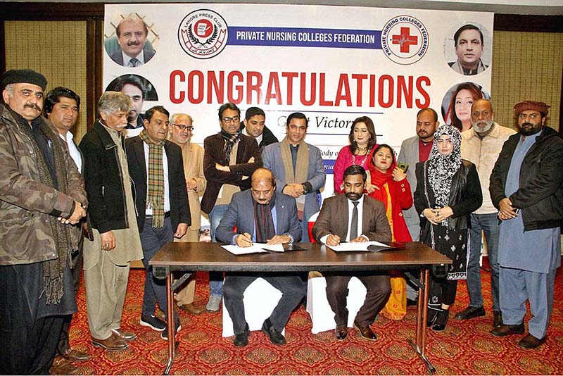 Patron-in-Chief of Private Nursing Colleges Federation Mahmood Sadiq Dhotar and President of Lahore Press Club Arshad Ansari are signing the Memorandum of Understanding (MOU) in the ceremony regarding the admission of children of journalists on scholarship in private Nursing Colleges