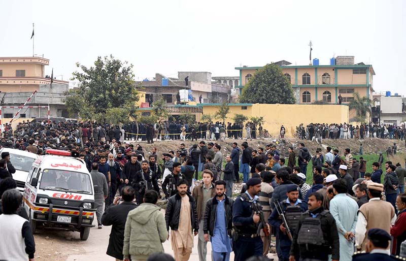 ISLAMABAD: February 06 – People and security personnel gather at the blast site after a powerful bomb blast at the gate of Tarlai Imambargah killed and injured several people in the Shehzad Town area of the federal capital. APP/ADZ/MAF/ABB