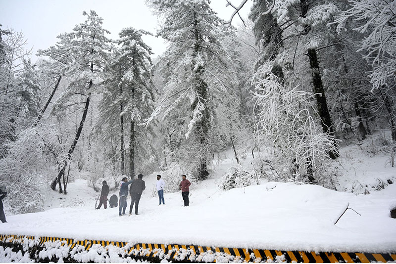 MURREE: February 20 – An attractive view of snow covered trees and road during heavy snowfall in the city during morning time. APP/ADZ/MAF/TZD