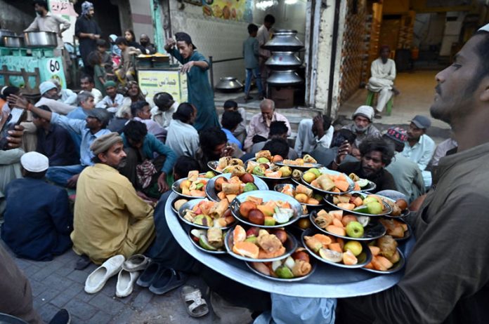 HYDERABAD: February 23 – Volunteers distribute free Iftar meals at Pukka Fort Road during Ramazan-ul-Mubarak. APP/AK/MAF/FHA/SSH